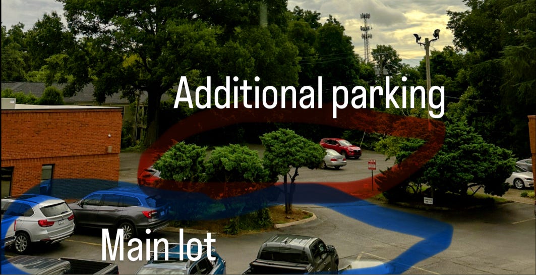There is a parking lot directly beside the building and in front of the main door; if that is full, there is more parking further down and to the side. Here is a picture of the parking lots looking out from a window in the prayer room.
